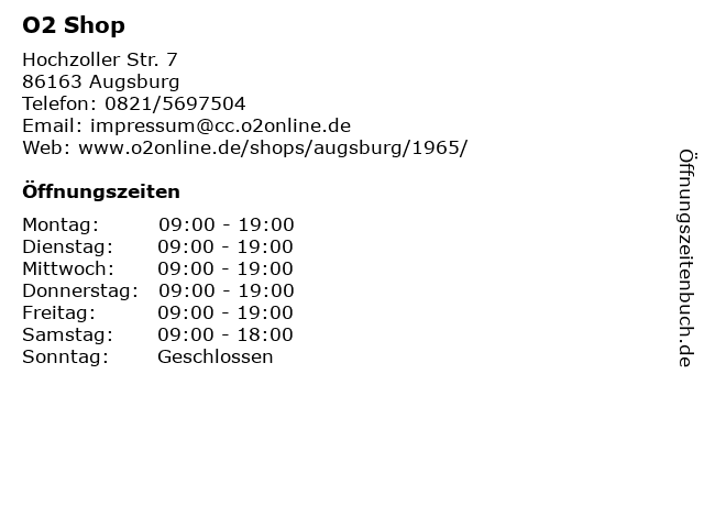 | Öffnungszeiten O2 Shop in Augsburg anzeigen | |