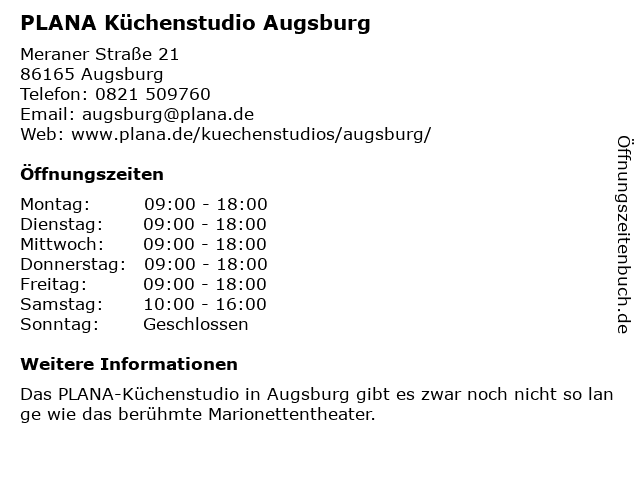 | Öffnungszeiten PLANA Küchenstudio Augsburg in Augsburg anzeigen | |