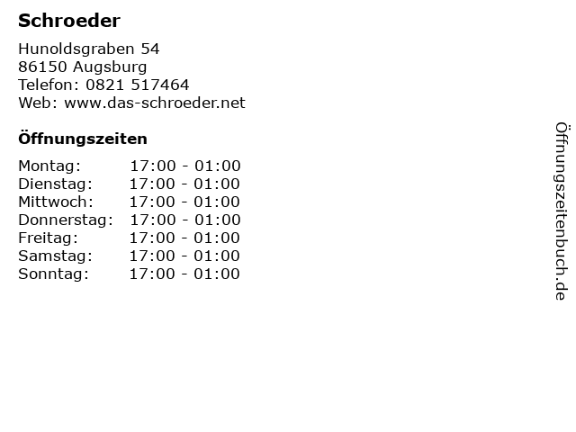 | Öffnungszeiten Schroeder in Augsburg anzeigen | |