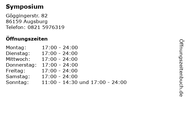 | Öffnungszeiten Symposium in Augsburg anzeigen | |
