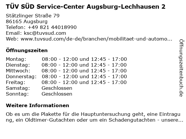 Branchen & Suchbegriffe zu TÜV SÜD Service-Center Augsburg-Lechhausen 2:abgasuntersuchung, center, hauptuntersuchung, kfz, lechhausen, oldtimergutachten, service, süd, tüv |