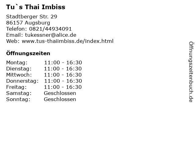 | Öffnungszeiten Tu`s Thai Imbiss in Augsburg anzeigen | |