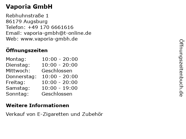 | Öffnungszeiten Vaporia GmbH in Augsburg anzeigen | |