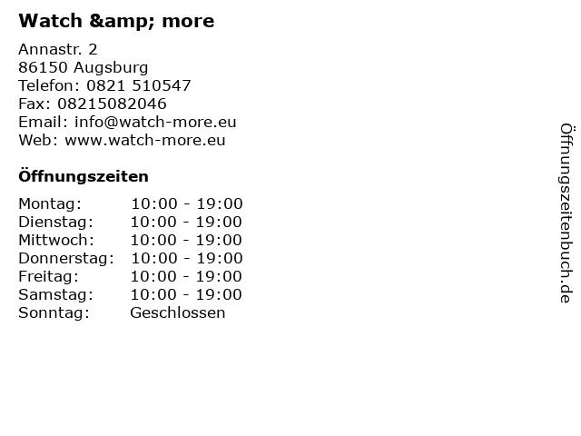 | Öffnungszeiten Watch & more in Augsburg anzeigen | |