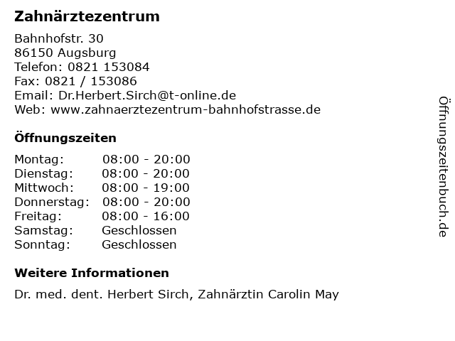 | Öffnungszeiten Zahnärztezentrum in Augsburg anzeigen | |
