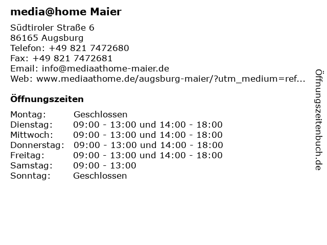 | Öffnungszeiten media@home Maier in Augsburg anzeigen | |