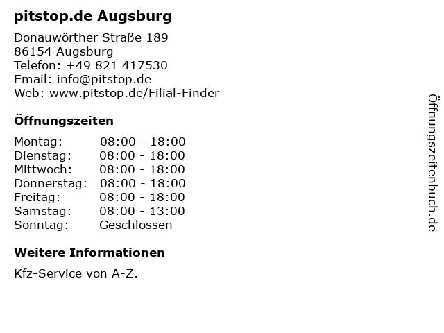 | Öffnungszeiten pitstop.de Augsburg in Augsburg anzeigen | |