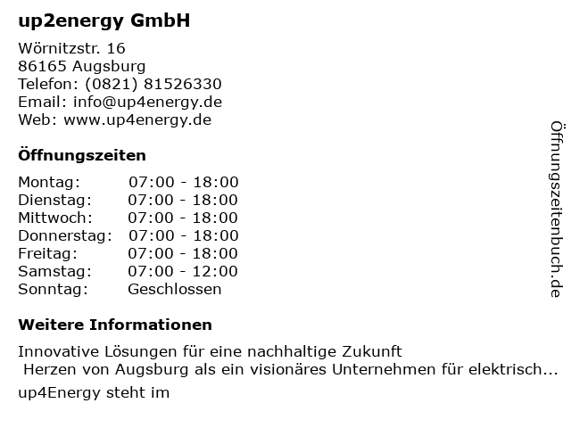 | Öffnungszeiten up2energy GmbH in Augsburg anzeigen | |