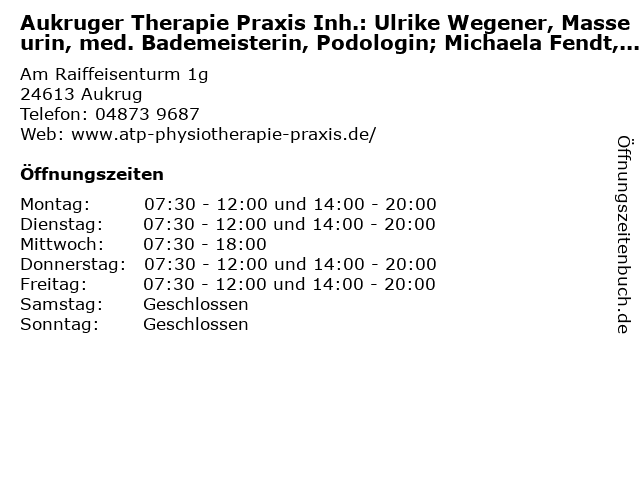 Branchen & Suchbegriffe zu Aukruger Therapie Praxis Inh.: Ulrike Wegener, Masseurin, med. Bademeisterin, Podologin; Michaela Fendt, Physiotherapeutin, zert. Pilatestrainerin:aukruger, bademeisterin, fendt, masseurin, med., michaela, michaela fendt, physiotherapeutin, pilatestrainerin, podologin;, praxis, therapie, ulrike, ulrike wegener, wegener, zert. |