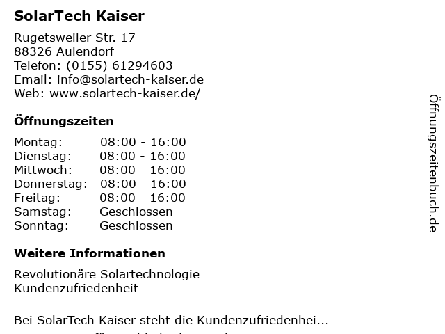 | Öffnungszeiten SolarTech Kaiser in Aulendorf anzeigen | |