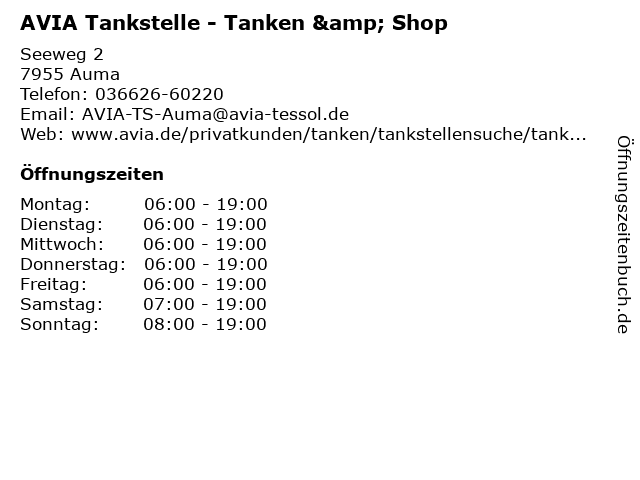 | Öffnungszeiten AVIA Tankstelle - Tanken & Shop in Auma anzeigen | |
