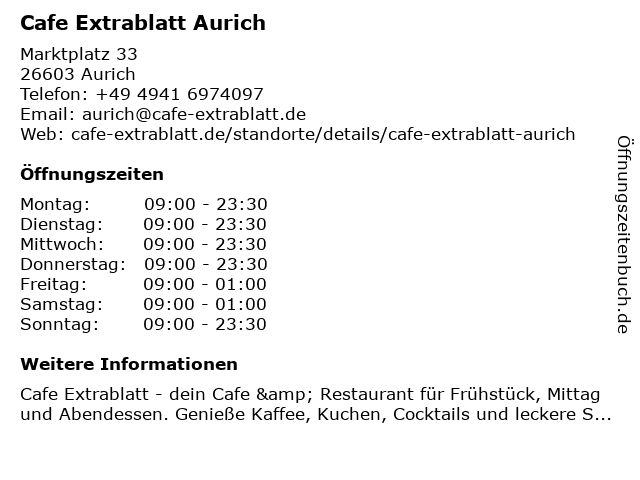 | Öffnungszeiten Cafe Extrablatt Aurich in Aurich anzeigen | |