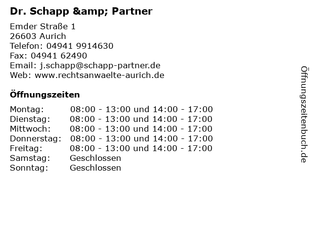 | Öffnungszeiten Dr. Schapp & Partner in Aurich anzeigen | |