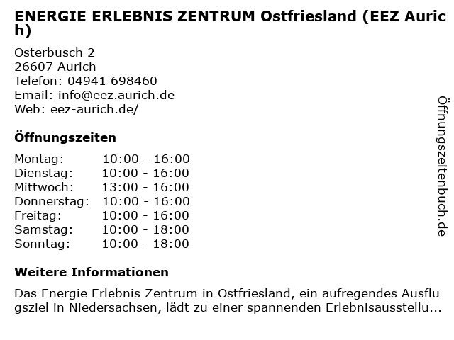 Branchen & Suchbegriffe zu ENERGIE ERLEBNIS ZENTRUM Ostfriesland (EEZ Aurich):aurich, eez, energie, entertainer, erlebnis, ostfriesland, zentrum |