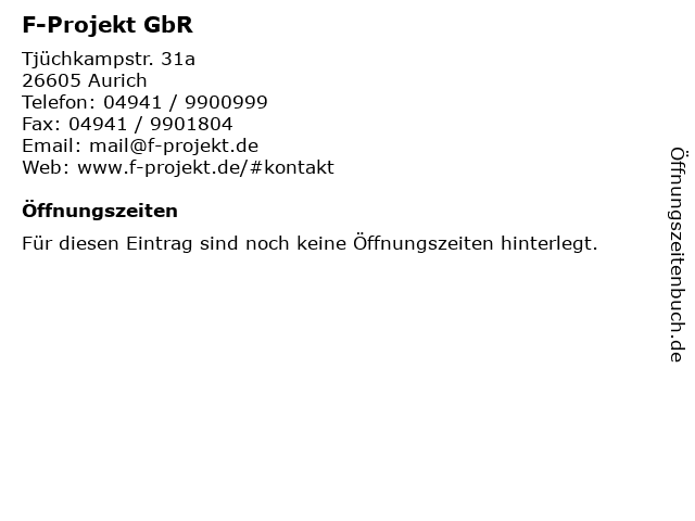 | Öffnungszeiten F-Projekt GbR in Aurich anzeigen | |