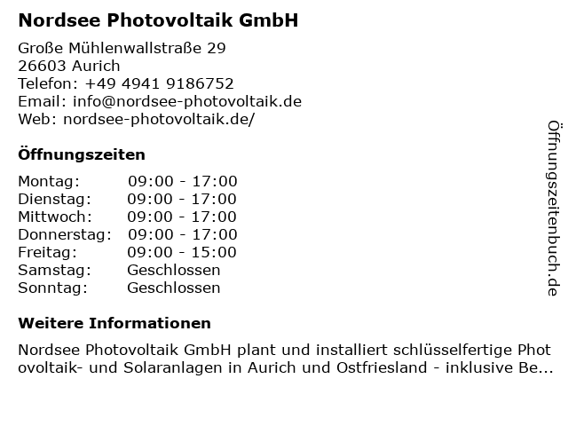 | Öffnungszeiten Nordsee Photovoltaik GmbH in Aurich anzeigen | |