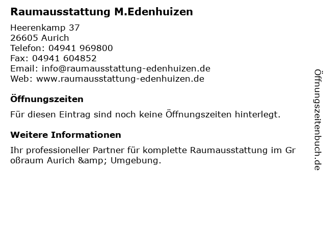 | Öffnungszeiten Raumausstattung M.Edenhuizen in Aurich anzeigen | |