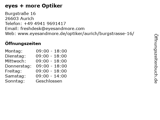 | Öffnungszeiten eyes + more Optiker in Aurich anzeigen | |