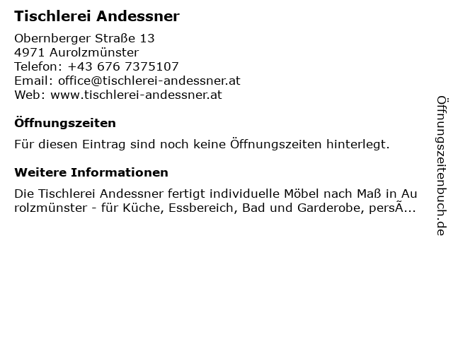 | Öffnungszeiten Tischlerei Andessner in Aurolzmünster anzeigen | |