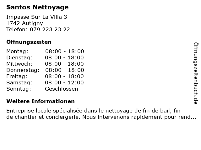 Öffnungszeiten Santos Nettoyage in Autigny anzeigen | |