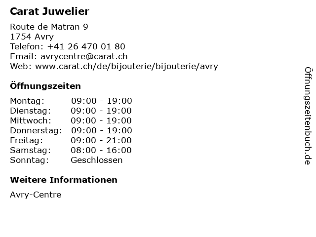 | Öffnungszeiten Carat Juwelier in Avry anzeigen | |
