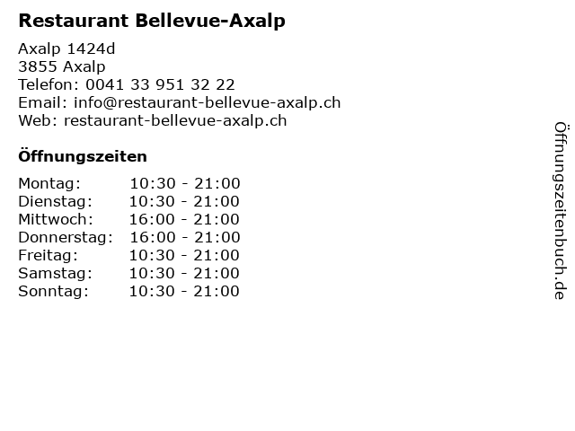 | Öffnungszeiten Restaurant Bellevue-Axalp in Axalp anzeigen | |