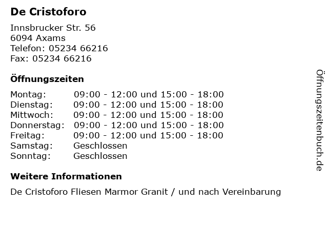 | Öffnungszeiten De Cristoforo in Axams anzeigen | |