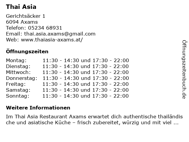 | Öffnungszeiten Thai Asia in Axams anzeigen | |