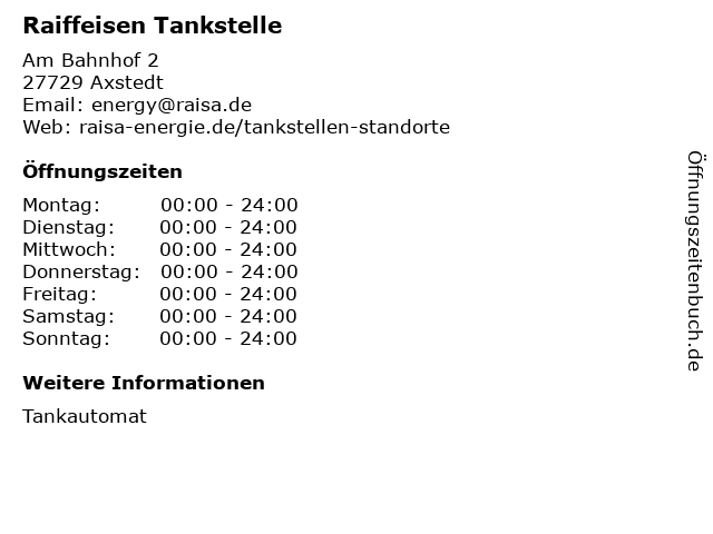 | Öffnungszeiten Raiffeisen Tankstelle in Axstedt anzeigen | |