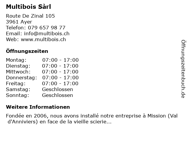 | Öffnungszeiten Multibois Sàrl in Ayer anzeigen | |