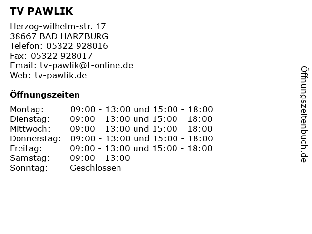 | Öffnungszeiten TV PAWLIK in BAD HARZBURG anzeigen | |