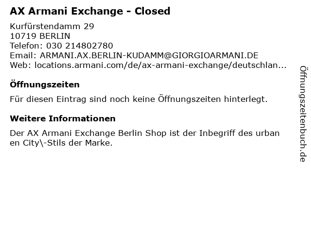 | Öffnungszeiten AX Armani Exchange - Closed in BERLIN anzeigen | |