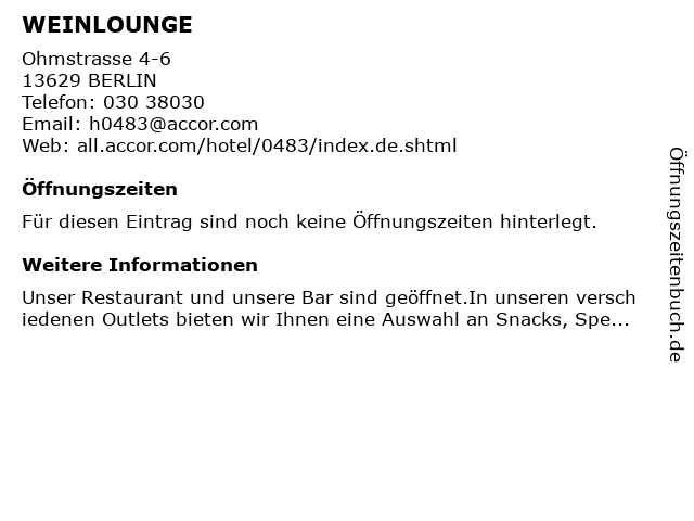 | Öffnungszeiten WEINLOUNGE in BERLIN anzeigen | |