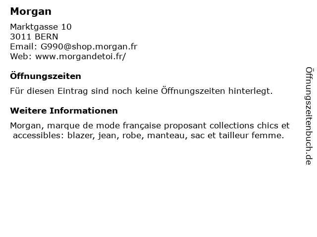 | Öffnungszeiten Morgan in BERN anzeigen | |