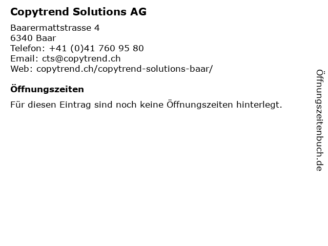 | Öffnungszeiten Copytrend Solutions AG in Baar anzeigen | |