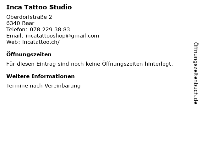 | Öffnungszeiten Inca Tattoo Studio in Baar anzeigen | |