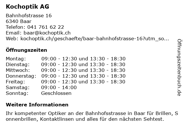 | Öffnungszeiten Kochoptik AG in Baar anzeigen | |