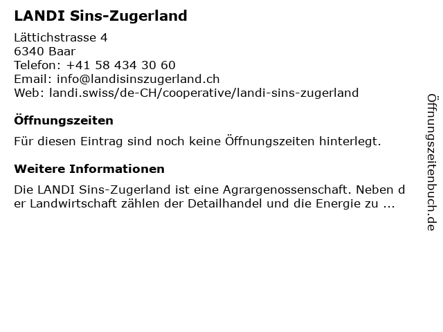 | Öffnungszeiten LANDI Sins-Zugerland in Baar anzeigen | |