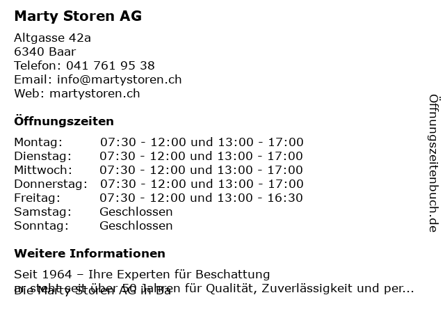 | Öffnungszeiten Marty Storen AG in Baar anzeigen | |