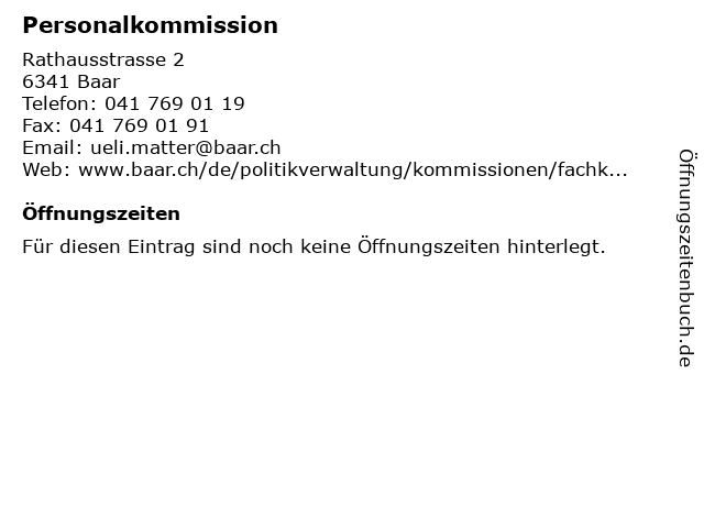 | Öffnungszeiten Personalkommission in Baar anzeigen | |