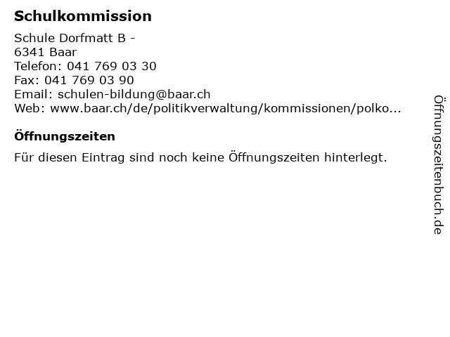 | Öffnungszeiten Schulkommission in Baar anzeigen | |