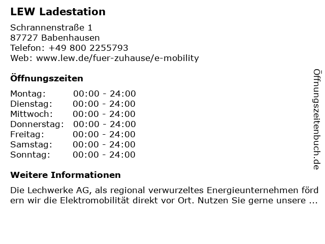 | Öffnungszeiten LEW Ladestation in Babenhausen anzeigen | |