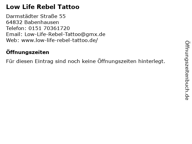 | Öffnungszeiten Low Life Rebel Tattoo in Babenhausen anzeigen | |