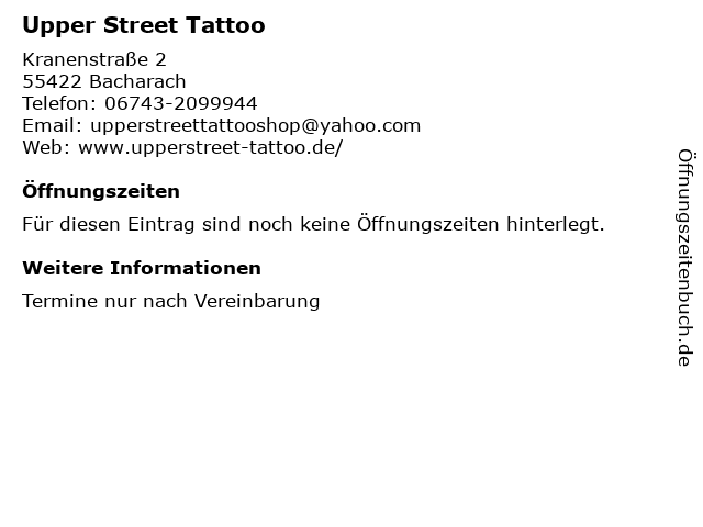| Öffnungszeiten Upper Street Tattoo in Bacharach anzeigen | |