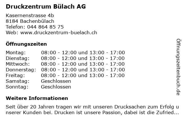 | Öffnungszeiten Druckzentrum Bülach AG in Bachenbülach anzeigen | |