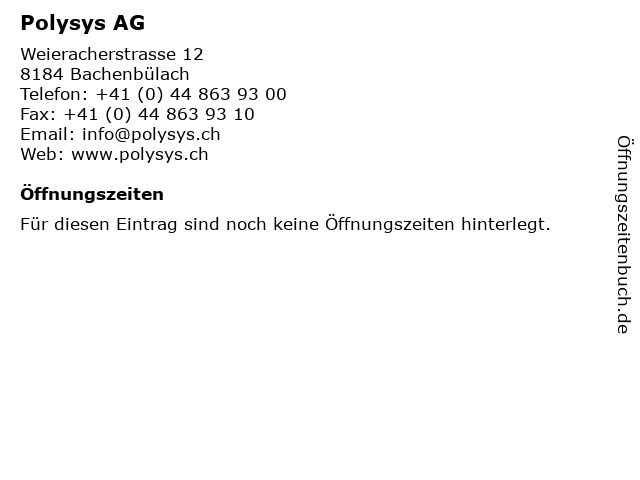 | Öffnungszeiten Polysys AG in Bachenbülach anzeigen | |