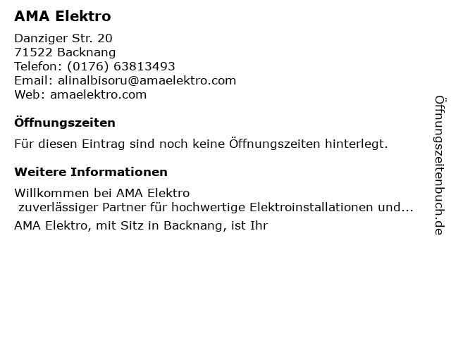 | Öffnungszeiten AMA Elektro in Backnang anzeigen | |