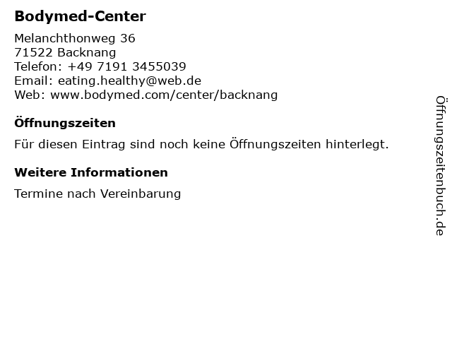 | Öffnungszeiten Bodymed-Center in Backnang anzeigen | |