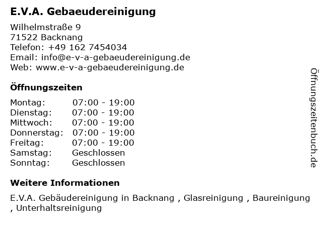 | Öffnungszeiten E.V.A. Gebaeudereinigung in Backnang anzeigen | |