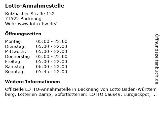 | Öffnungszeiten Lotto-Annahmestelle in Backnang anzeigen | |